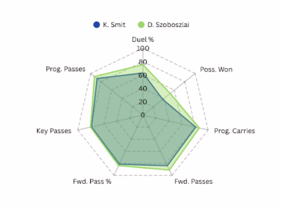 Apart from a select few areas in his game needing development such as his tackling, Smit is not too distant from the Hungarian in key metrics such as progressive passes, forward passes and progressive carries.